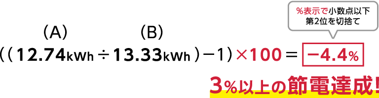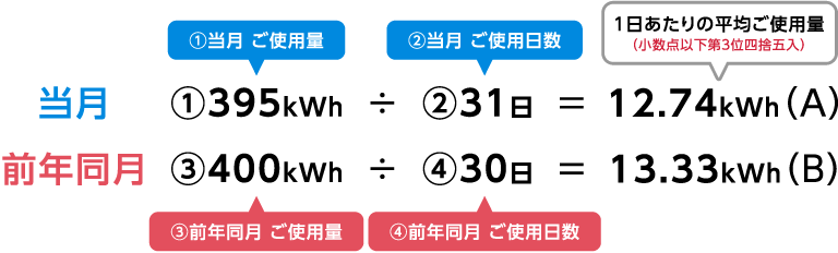 - ご使用日数の差を考慮し、各月分ごとに、前年同月と「1日あたりの平均ご使用量(小数点以下第3位を四捨五入)」を比較し、3%以上の削減率の場合に節電達成と判定します。